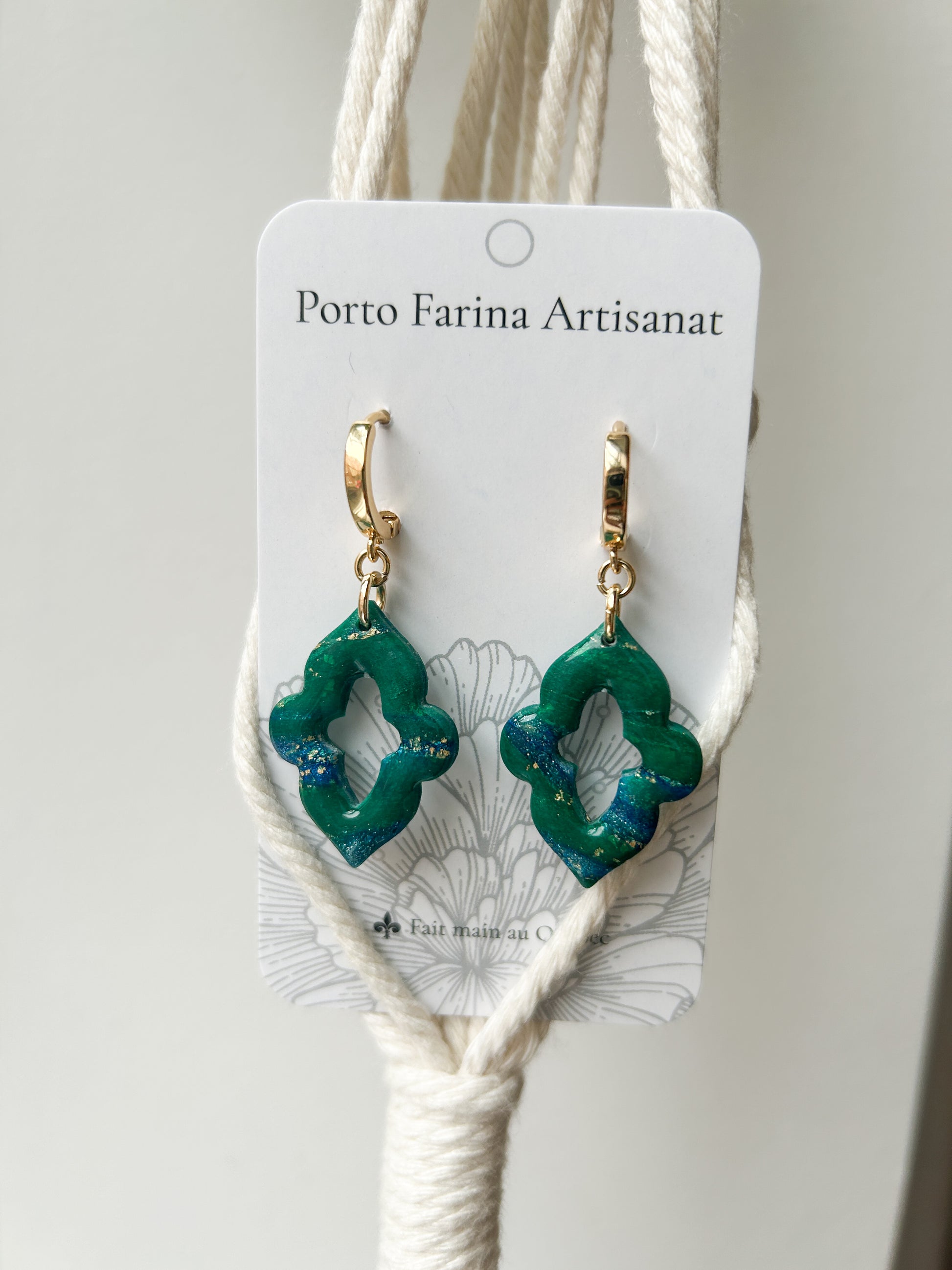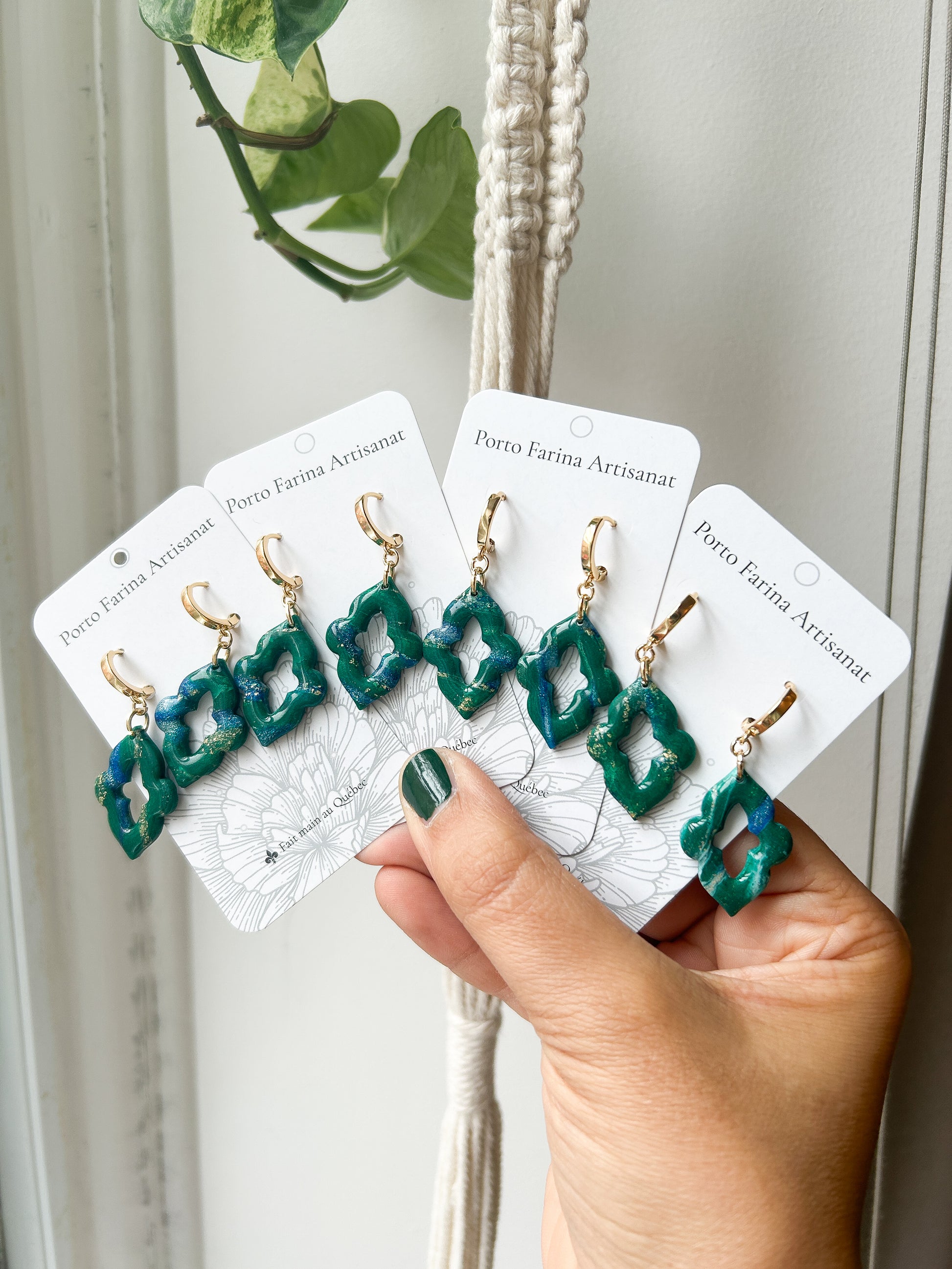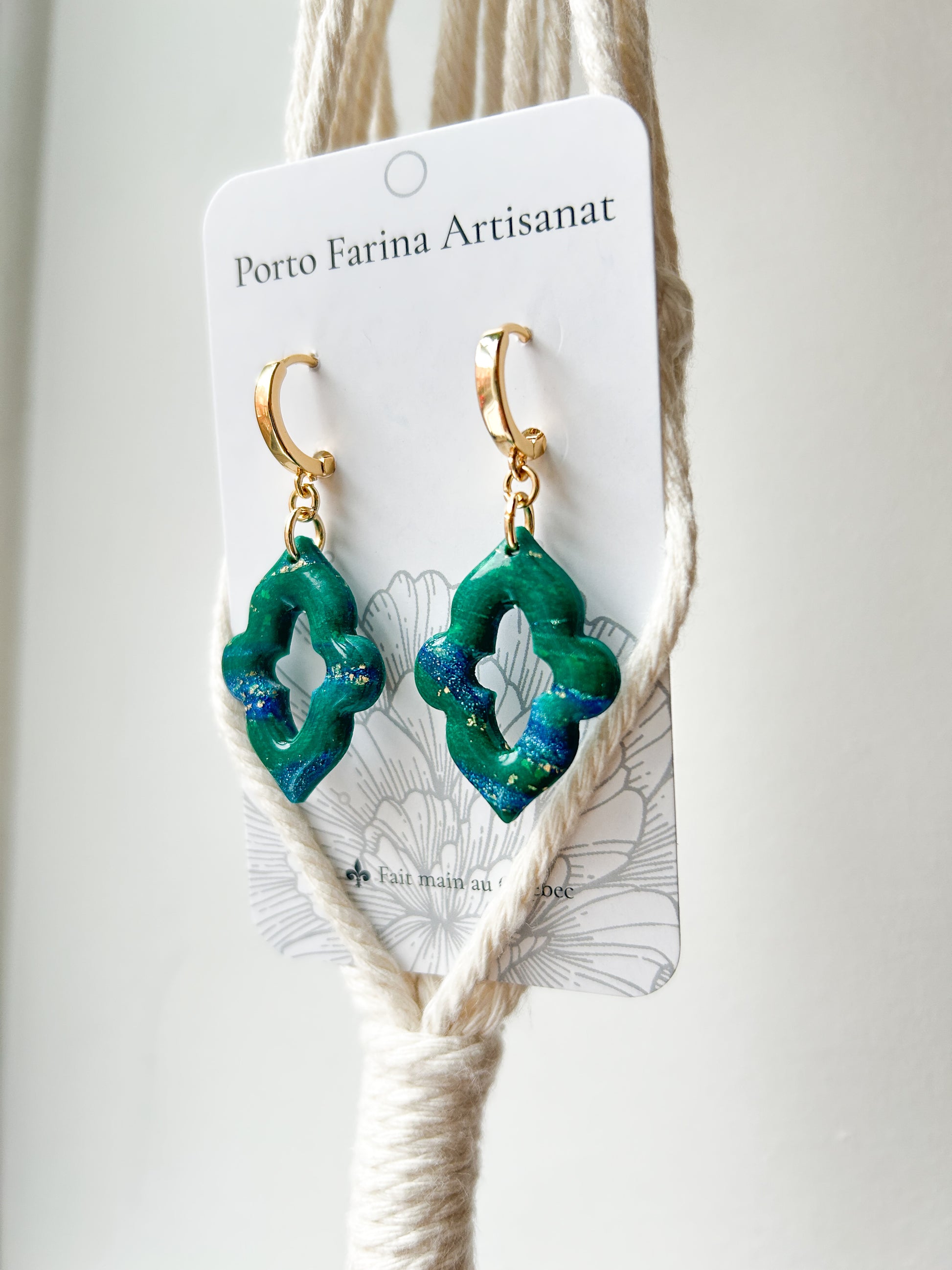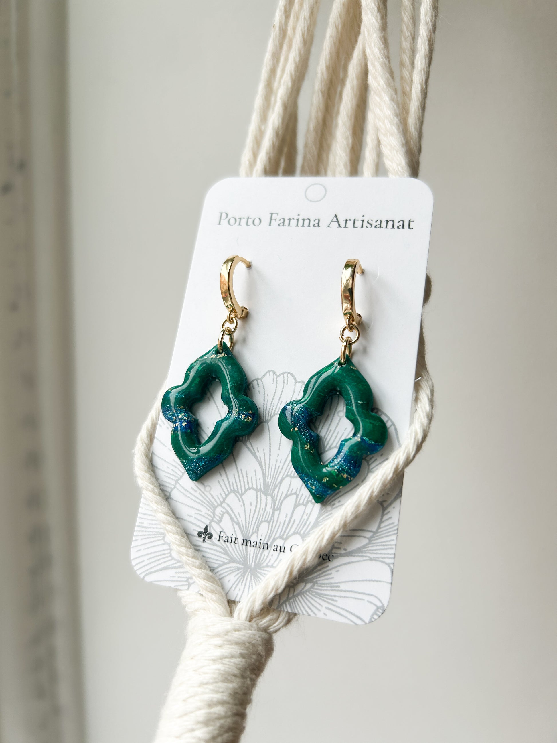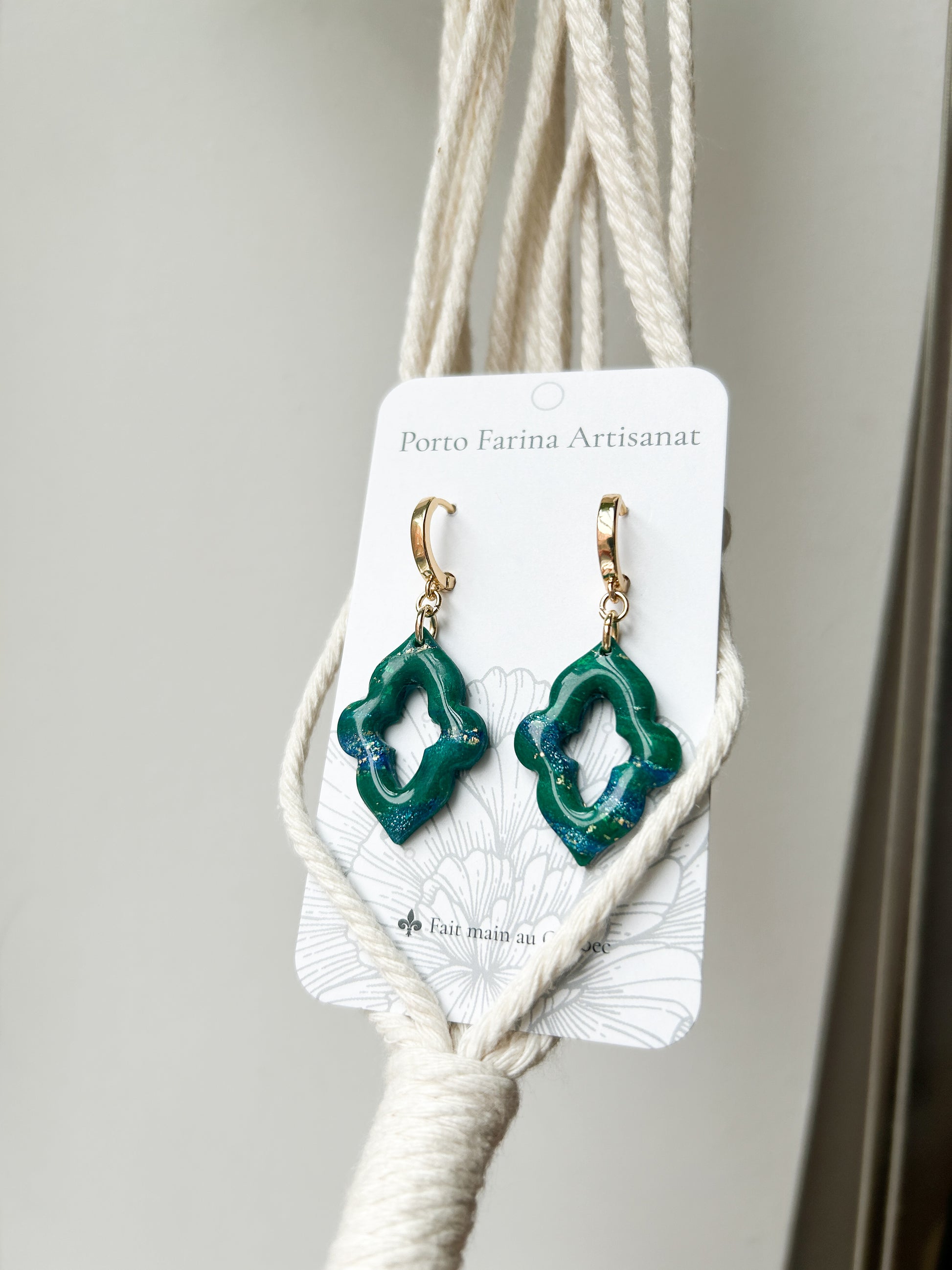 Ces boucles d’oreilles en vert forêt profond, parsemées de touches bleutées et d’éclats dorés, célèbrent l’approche de l’automne avec élégance.