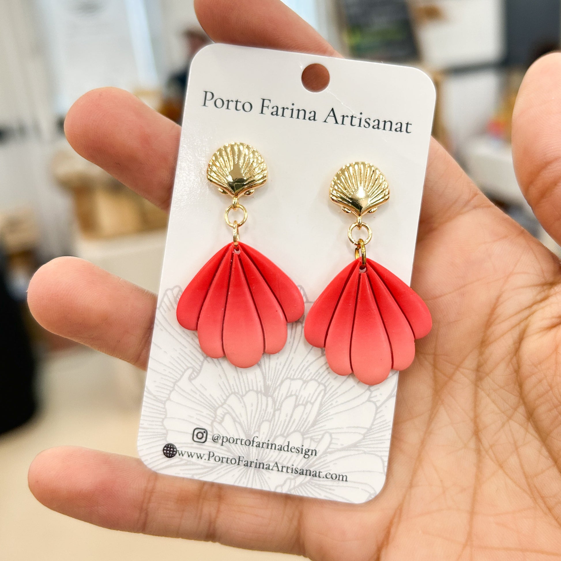 Boucles d’oreilles en argile polymère couleur corail, montées sur des attaches en acier inoxydable avec finition coquillage doré.