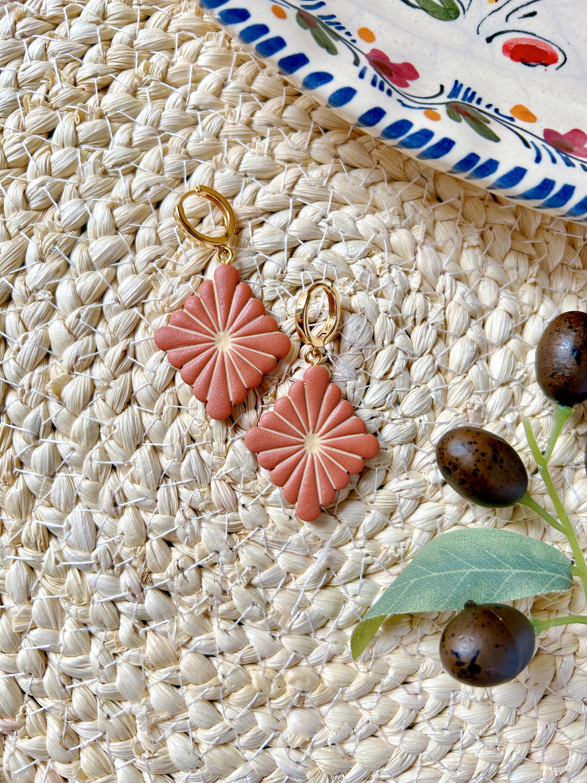 Boucles d’oreilles en argile polymère couleur terracotta, de forme carrée aux angles adoucis, ornées d’un motif géométrique rayonnant en ton crème.