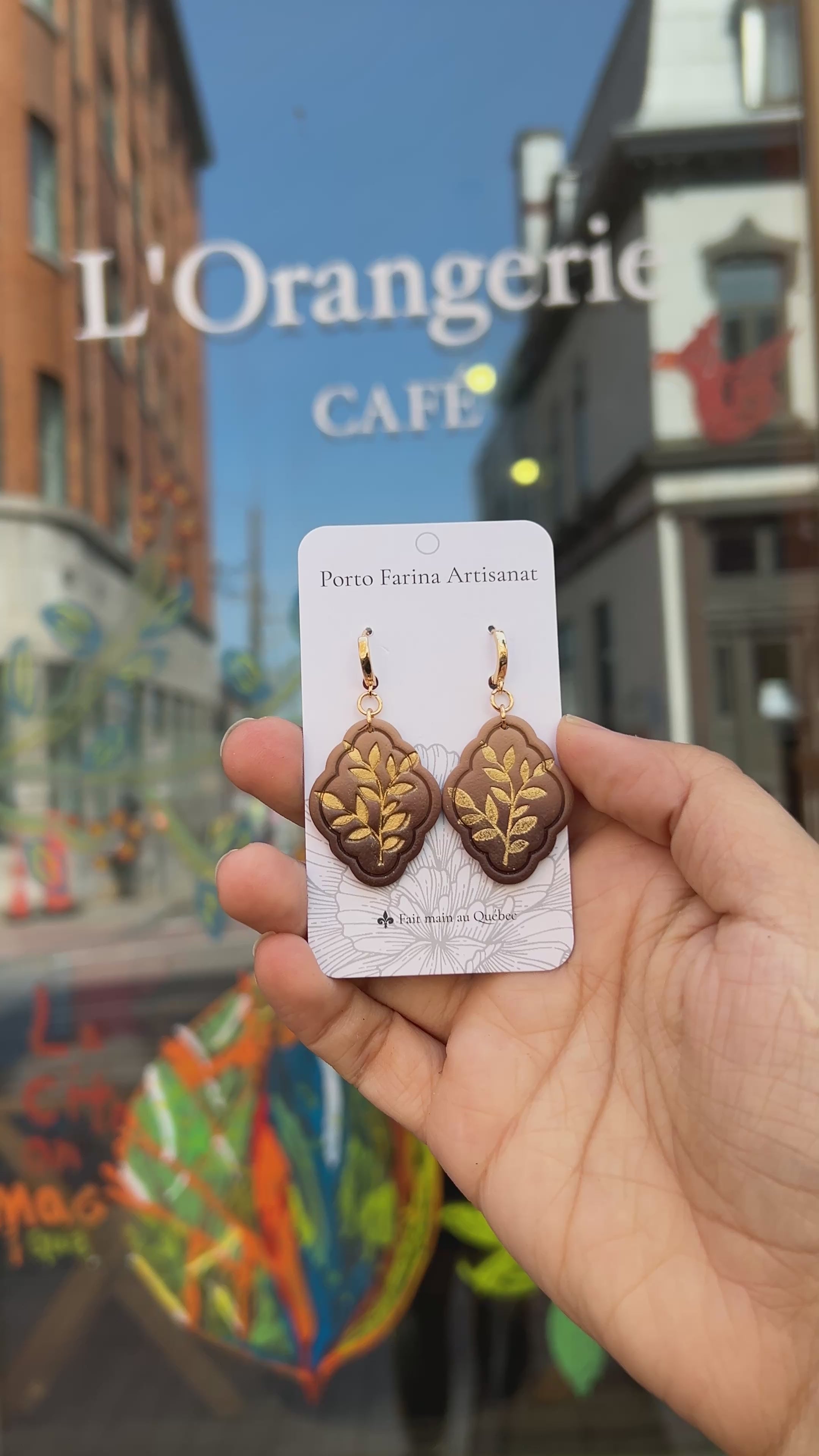 Élégantes boucles d’oreilles en argile polymère, ornées d’un feuillage doré délicatement texturé. Leur forme inspirée des arches orientales apporte une touche intemporelle et raffinée.