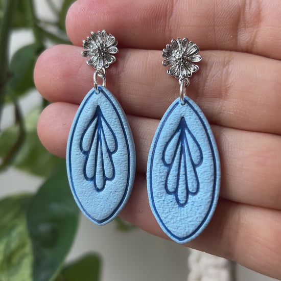 Élégantes et apaisantes, ces boucles d’oreilles s’inspirent du mouvement des feuilles et des motifs méditerranéens stylisés. Le bleu clair rappelle la mer calme sous le soleil, tandis que les attaches florales argentées apportent une note délicate et intemporelle.